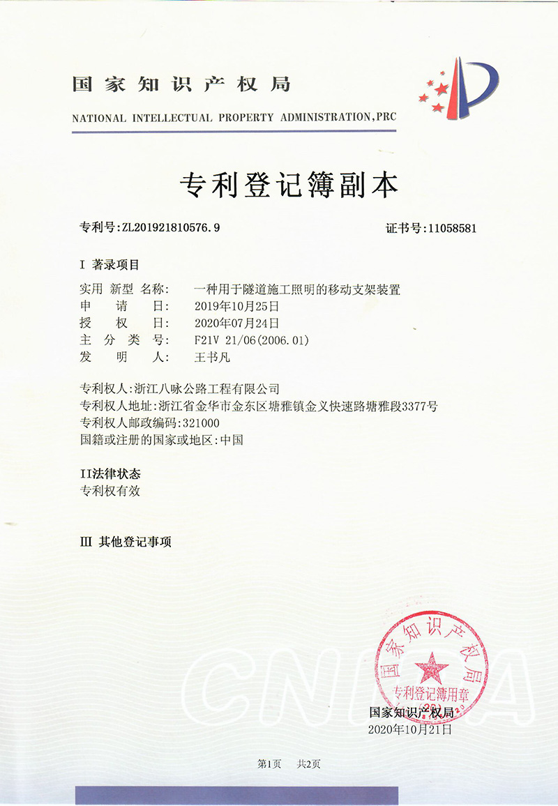 便捷式高速公路微型修补设备-实用新型专利证书(签章)
