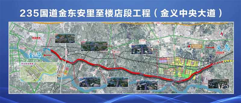 235 国道起自江苏省新沂市,终于广东省海丰县,南北纵跨江苏、安徽、浙江、福建、广东五省,金义中央大道的开工建设将极大地推动金华融入长三角区域一体化发展等国家战略和大湾区“一环一带一路一通道”等省级战略。
