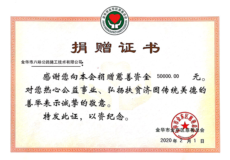 2月1日,金华市八咏公路施工技术有限公司向金华市金东区慈善总会,捐款人民币5万元,用于抗击疫情。