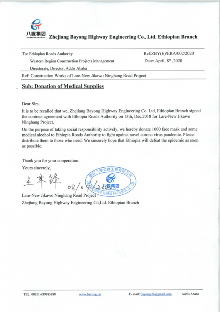图为埃塞办事处写给埃塞公路局的捐赠信